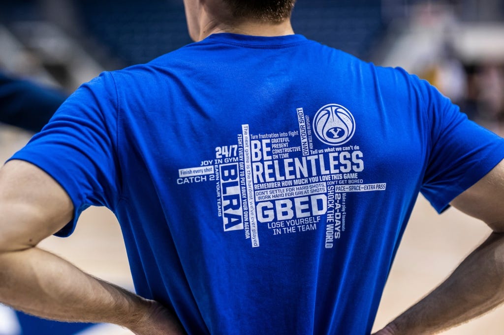 Pope’s statement is one among many that the BYU basketball team lives by. BYU has a “Word Wall” — an actual wall in their facility with 26 different words or phrases on it. These words are also printed on the back of their team shirts. Everyone in the organization is constantly stimulated with these words.