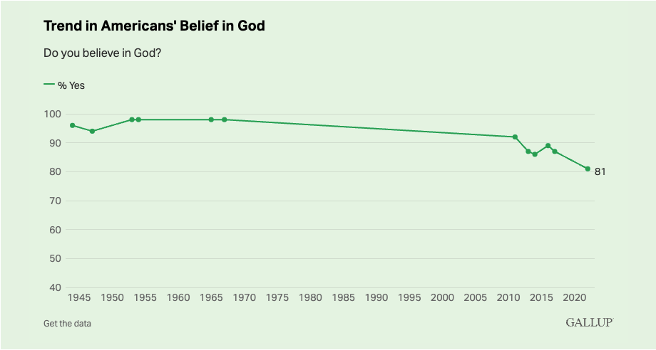 In 2022, Gallup reported that only 81% of Americans believe in God, the lowest number ever reported. "Between 1944 and 2011, more than 90% of Americans believed in God."